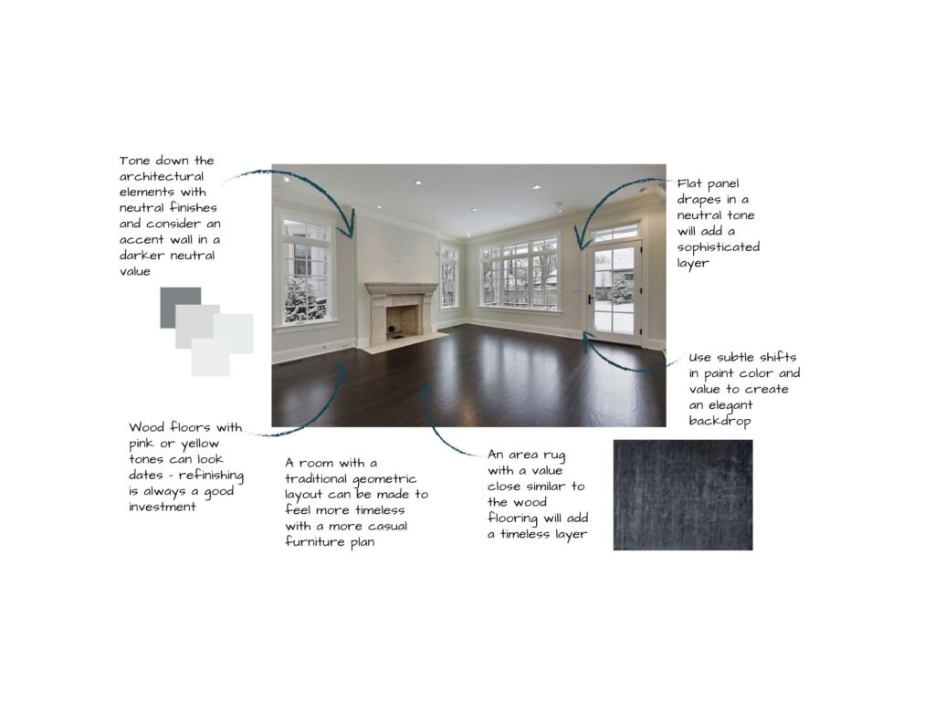 Wood floors are an asset and contribute generously to a timeless vibe. However, it’s worth refinishing them with updated stain colors if they have a dated pinkish or yellow tone. If refinishing isn’t an option, you can minimize their effects with area rugs.